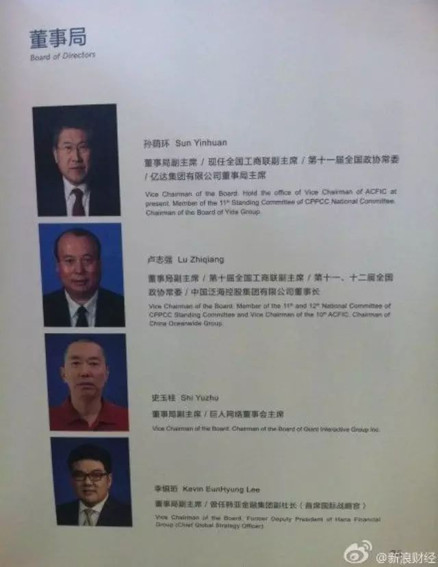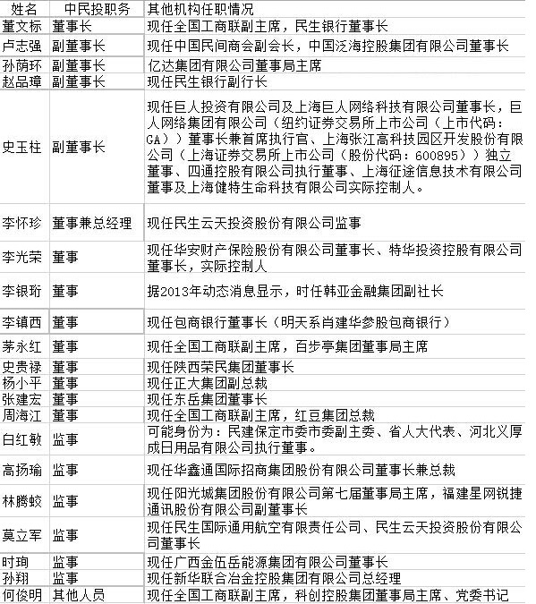 其中,董文标是民生银行董事长,赵品璋系民生银行副行长,史玉柱、卢志强各自控制的巨人集团、泛海集团,则在民生银行2014年一季报中分别为该行第四和第八大股东;卢志强还是民生银行副董事长。而孙荫环是大连亿达集团董事局主席、全国工商联副主席。